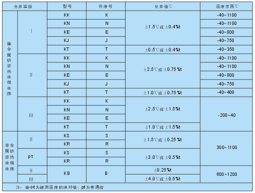 由不同型號(hào)的鎧裝熱電偶電纜制成的鎧裝熱電偶,當(dāng)參考端為0℃時(shí),熱電動(dòng)勢(shì)應(yīng)符合GB/T16839.1—1997《熱電偶第一部分:分度表》,不同等級(jí)的允差應(yīng)符合表1—3規(guī)定。